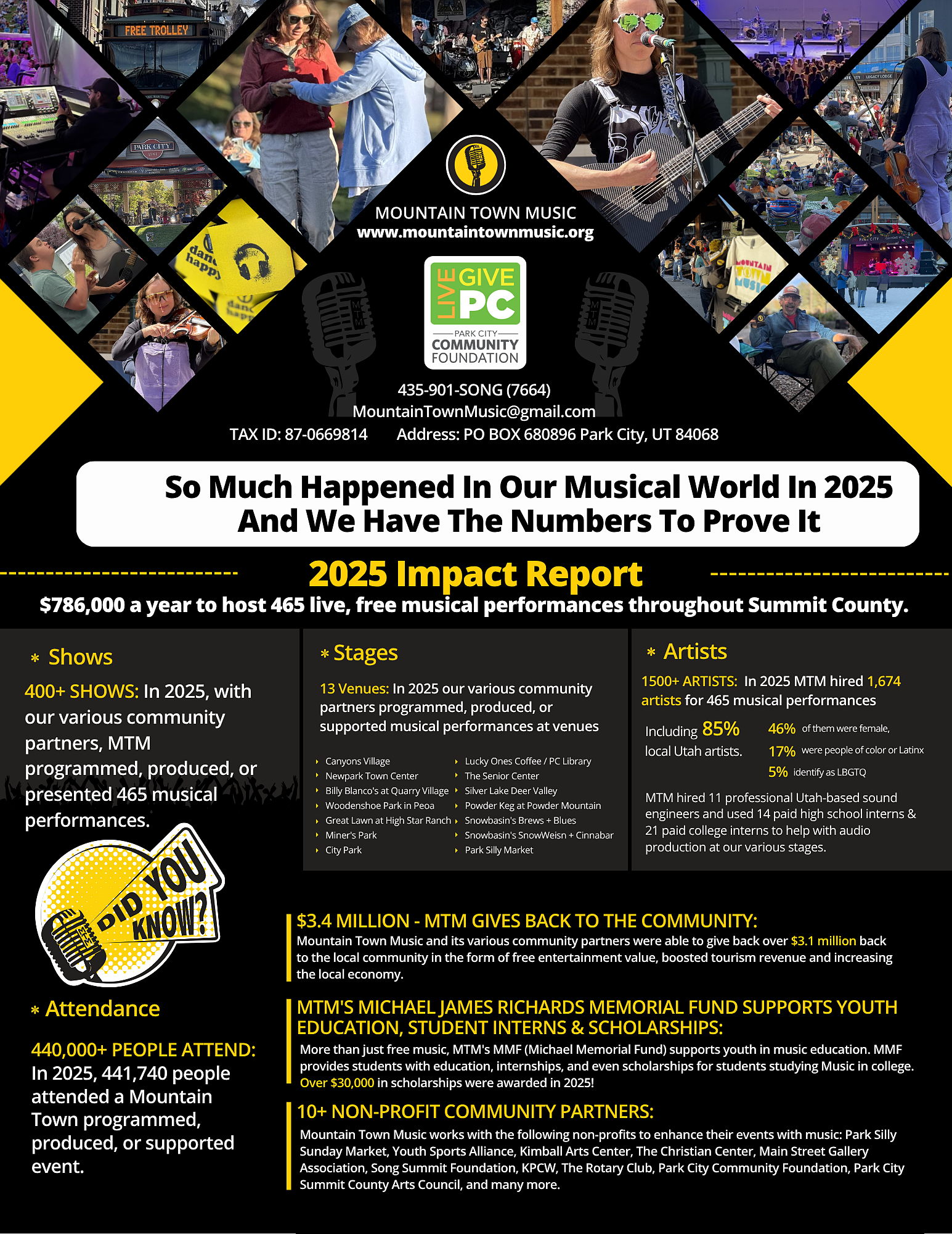 1,500+ ARTISTS: In 2025 MTM hired 1,674 artists for 465 musical performances, with an average of 85% being local UTAH artists, 46% were female fronted bands or female solo performances, 17% were people of color or Latinx, and 5% identified LBGTQ