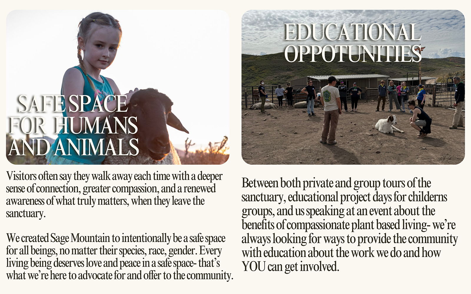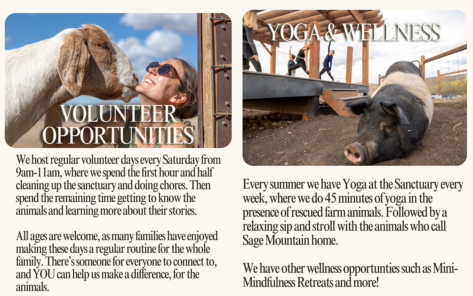 Sage Mountain Animal Sanctuary is more than a safe haven — it’s a place where compassion grows. We provide opportunities for Summit County residents to visit, volunteer, and experience the joy of connecting with animals in a peaceful, healing space.